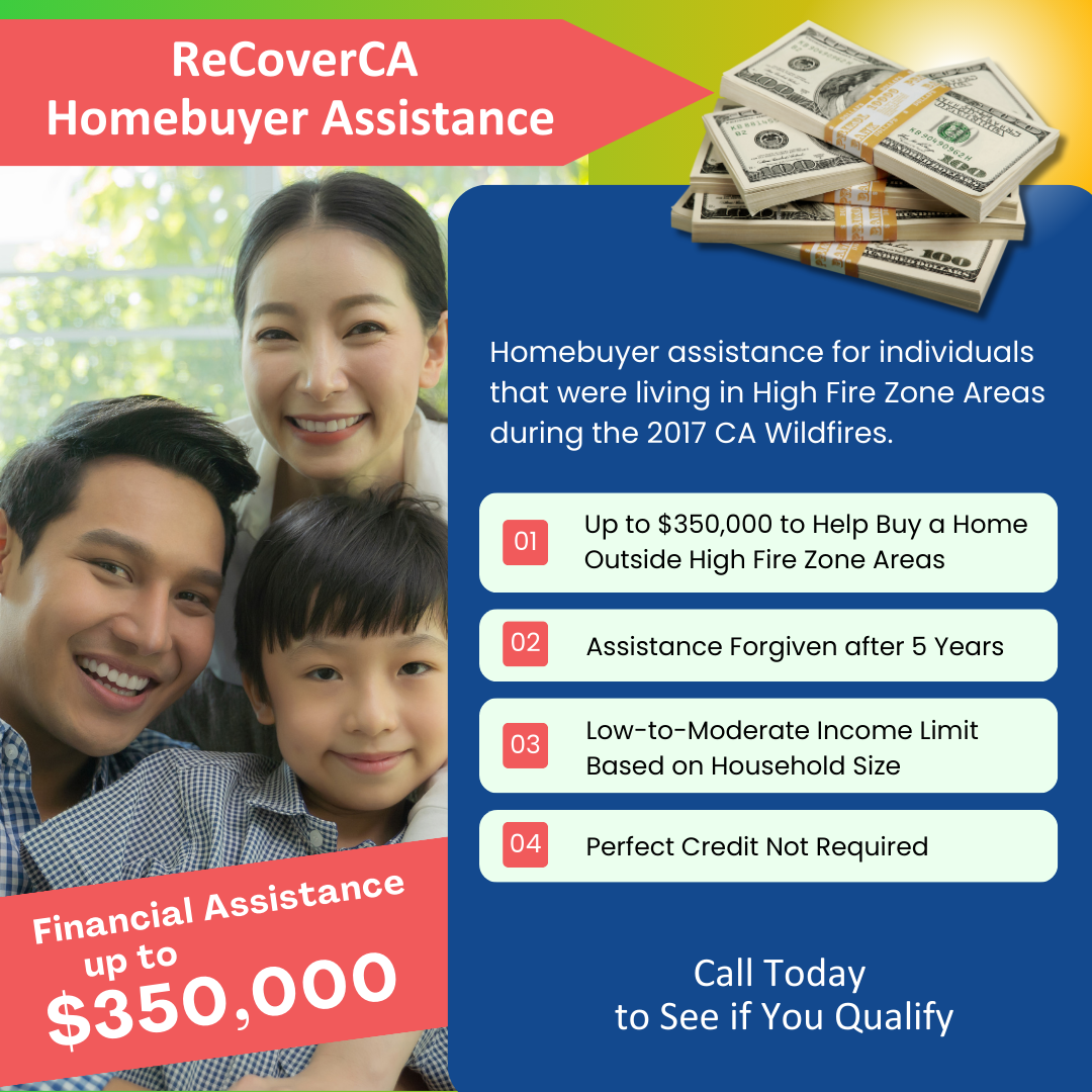 A coral, green, yellow, and deep blue graphic promoting the ReCoverCA Homebuyer Assistance Program for wildfire recovery. On the left, a smiling family of three is shown together, representing stability and homeownership, while a stack of U.S. dollar bills appears at the top right to emphasize financial support. Text explains that individuals who were living in high fire zone areas during the 2017 California wildfires may qualify for assistance. A coral banner highlights “Financial Assistance up to $350,000.” On the right, four numbered callouts describe key benefits: up to $350,000 to help buy a home outside high fire zone areas, assistance forgiven after 5 years, low-to-moderate income limits based on household size, and perfect credit not required. A call to action at the bottom encourages viewers to “Call today to see if you qualify.”