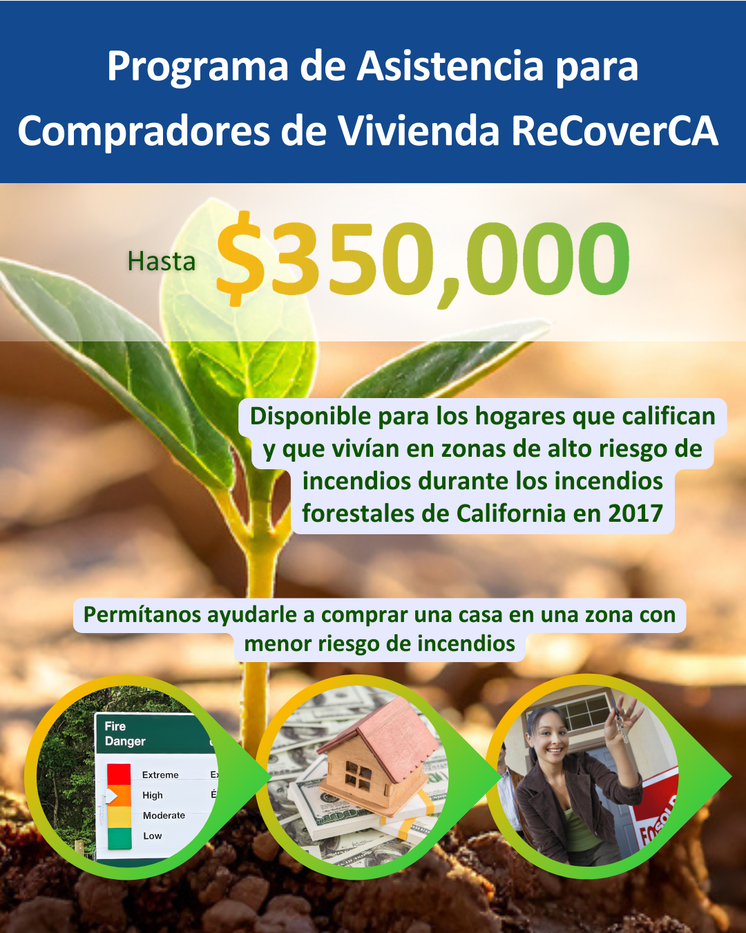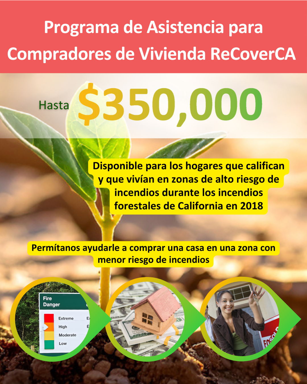 A Spanish-language graphic promoting the ReCoverCA HBA Program (Programa de Asistencia para Compradores de Vivienda ReCoverCA) highlights recovery after wildfire risk, with gold text highlighting “Hasta $350,000” in available assistance. A sprouting green plant symbolizes growth and resilience, while callout text explains the program is available to qualifying households who lived in high fire risk areas during the 2018 California wildfires. Along the bottom, simple icons illustrate the journey from wildfire danger to homeownership.