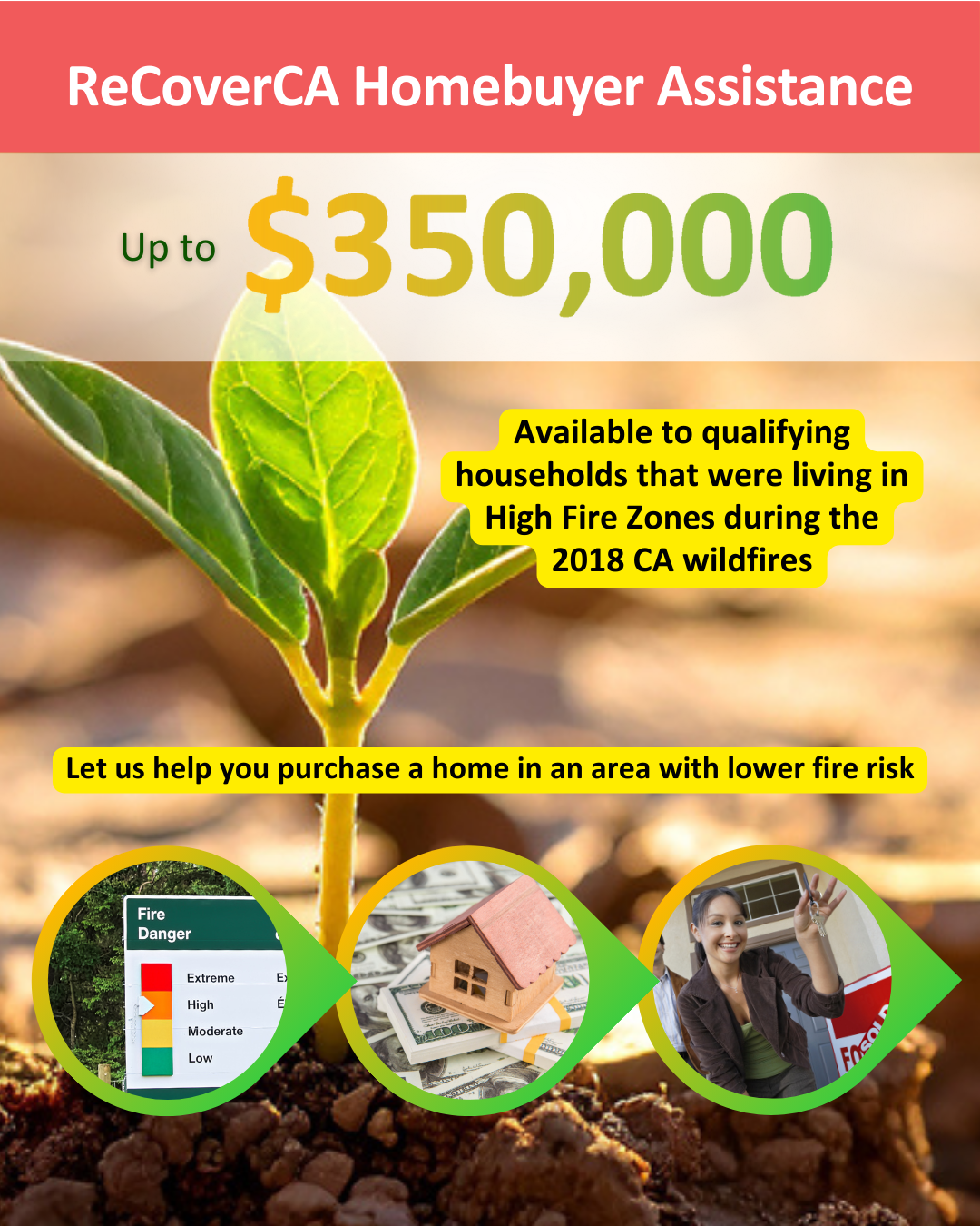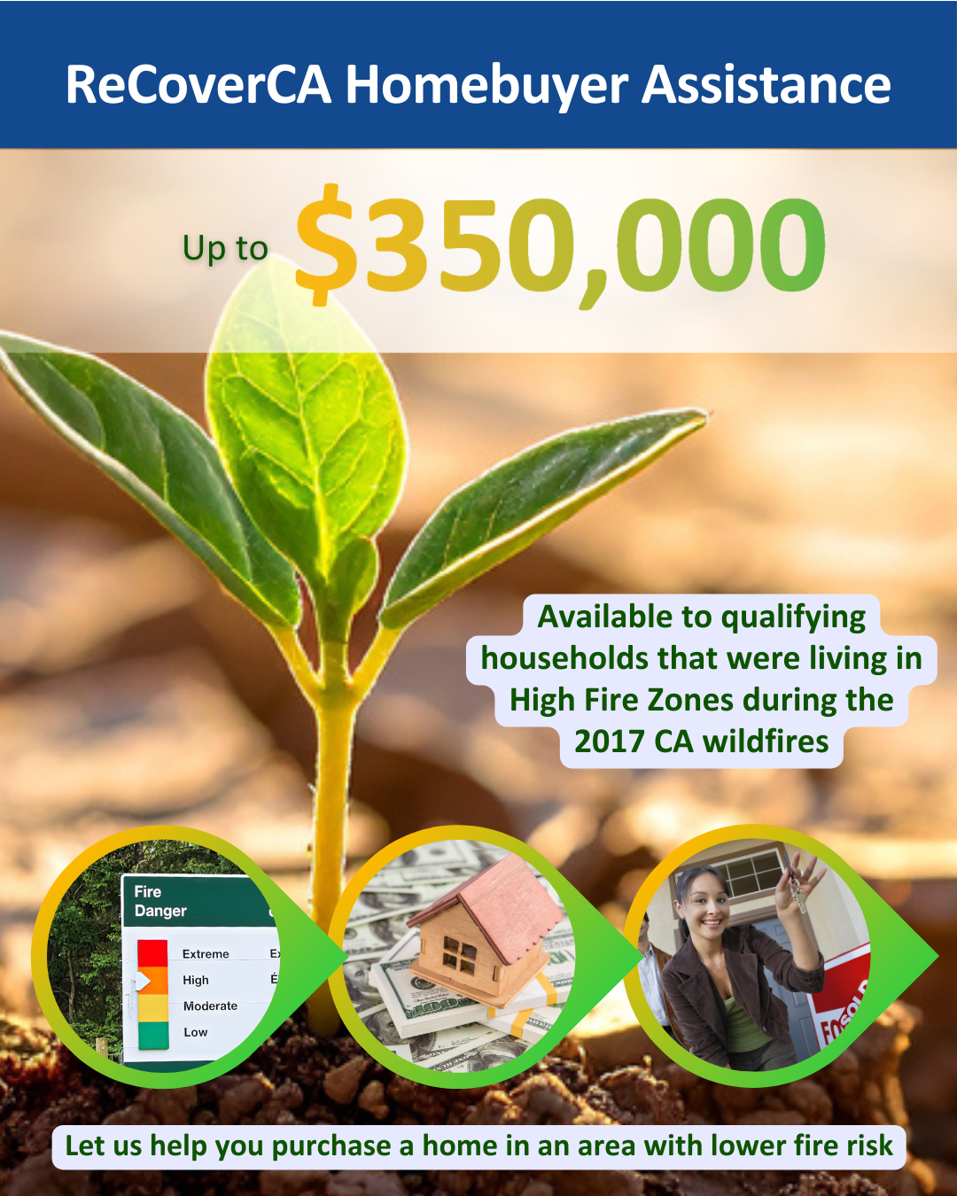 A blue, green, and earth-toned graphic promoting the ReCoverCA Homebuyer Assistance Program highlights financial help for wildfire recovery. At the top, a blue banner reads “ReCoverCA Homebuyer Assistance,” followed by large green and gold text emphasizing up to $350,000 in assistance. The background features a young green plant growing from soil, symbolizing recovery and new beginnings. Text explains that the program is available to qualifying households that were living in high fire zones during the 2017 California wildfires. Along the bottom, three circular images show a fire danger sign, a small house resting on stacks of money, and a smiling new homeowner holding keys, illustrating the path from wildfire risk to homeownership. A closing message encourages viewers to purchase a home in an area with lower fire risk.