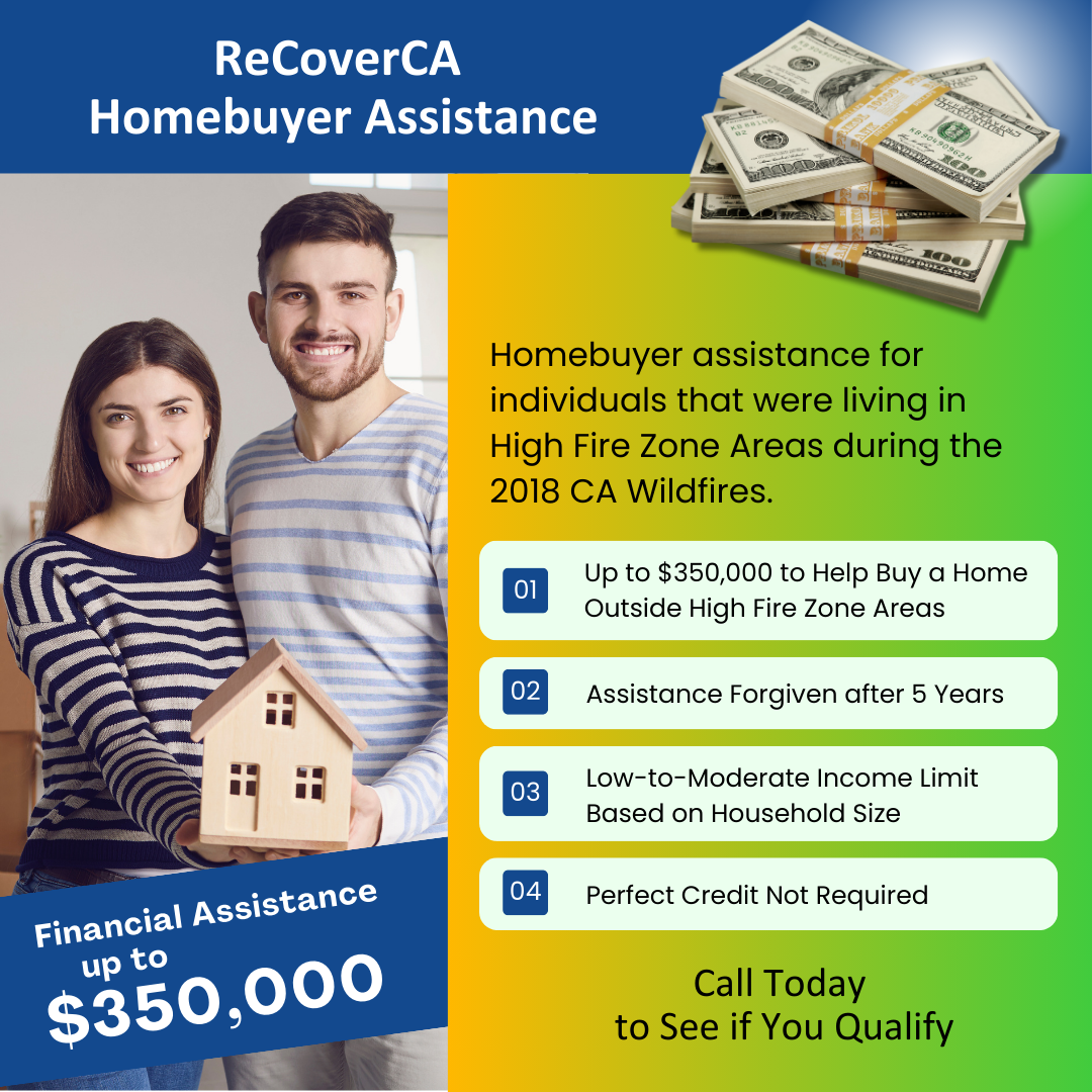 A bright green and blue graphic promoting the ReCoverCA Homebuyer Assistance Program, featuring a smiling couple holding a model house to symbolize new beginnings. Bold text highlights up to $350,000 in financial assistance for individuals who lived in high fire zones during the 2018 California wildfires. Numbered callouts explain key benefits, including help buying a home outside high-risk areas, forgiveness after five years, income-based eligibility, and no requirement for perfect credit, with a final call to action encouraging viewers to see if they qualify.