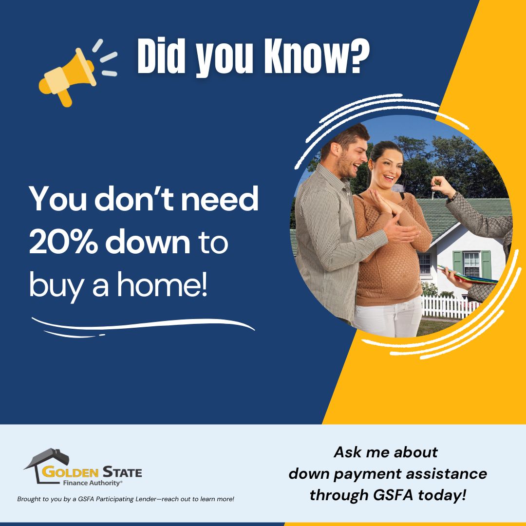 A blue and gold graphic featuring a man and a pregnant woman being handed keys to their new home. The text reads: "Did you know? You don't need 20% down to buy a home! Ask me about down payment assistance through GSFA today!"