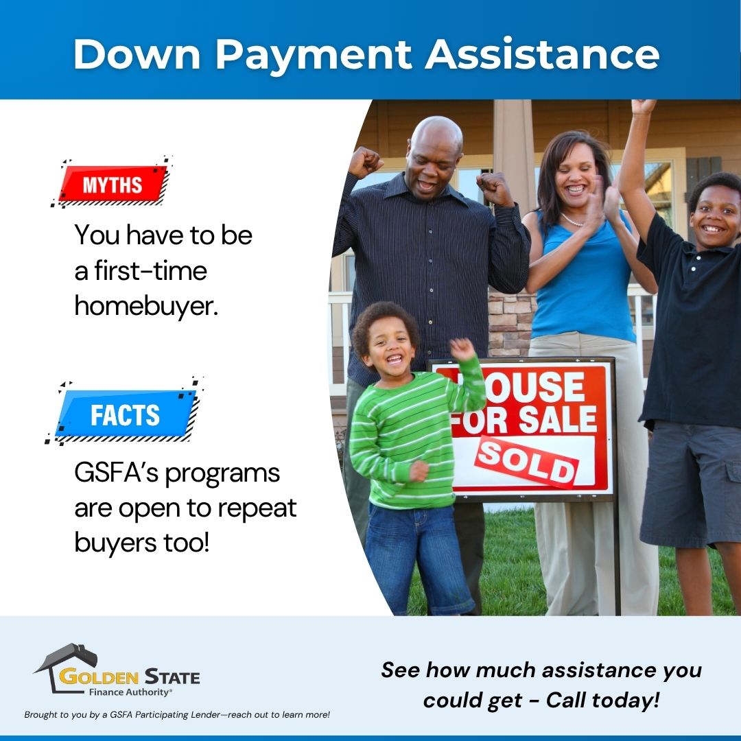 A blue and green graphic featuring a house sitting on top of stacks of money. The headline reads: "Did you know? You don't have to be a first-time buyer to qualify for Down Payment Assistance!"