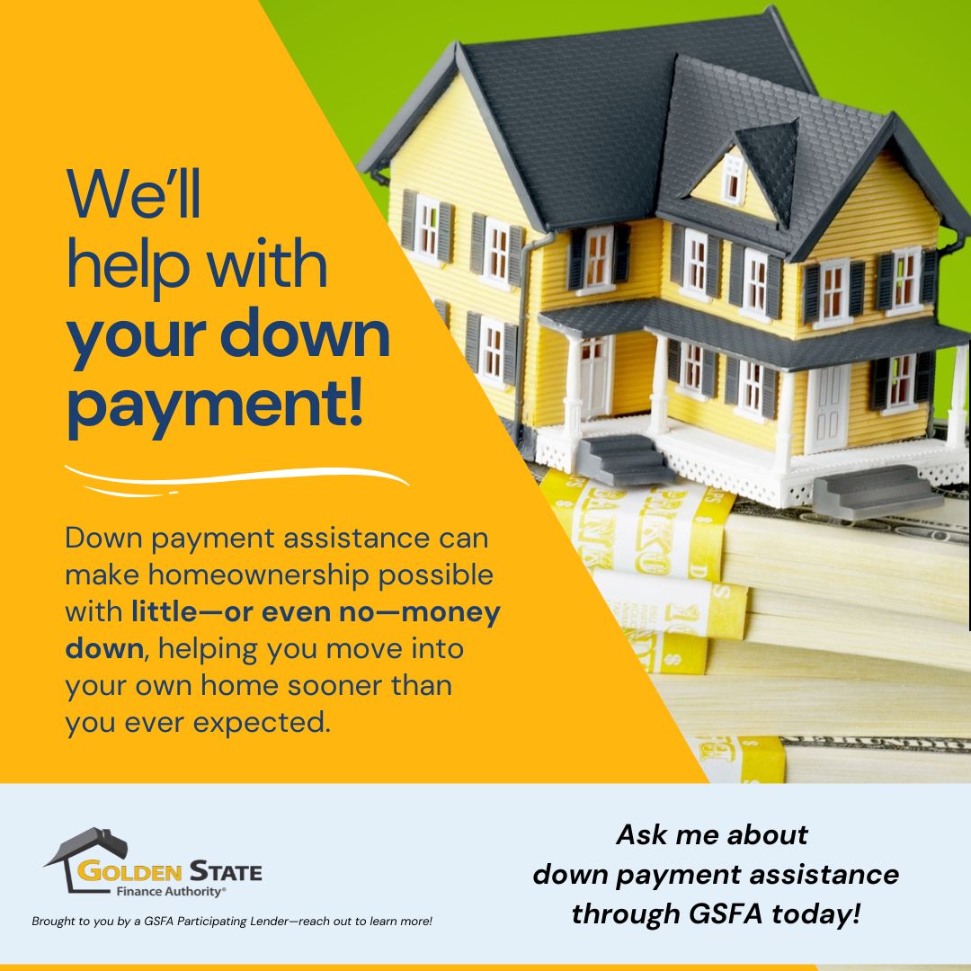 A gold and green graphic featuring a yellow house sitting on top of stacks of money in yellow bands. The headline reads: We'll help with your down payment! Down payment assistance can make homeownership possible with little—or even no-money down, helping you move into your own home sooner than you ever expected.