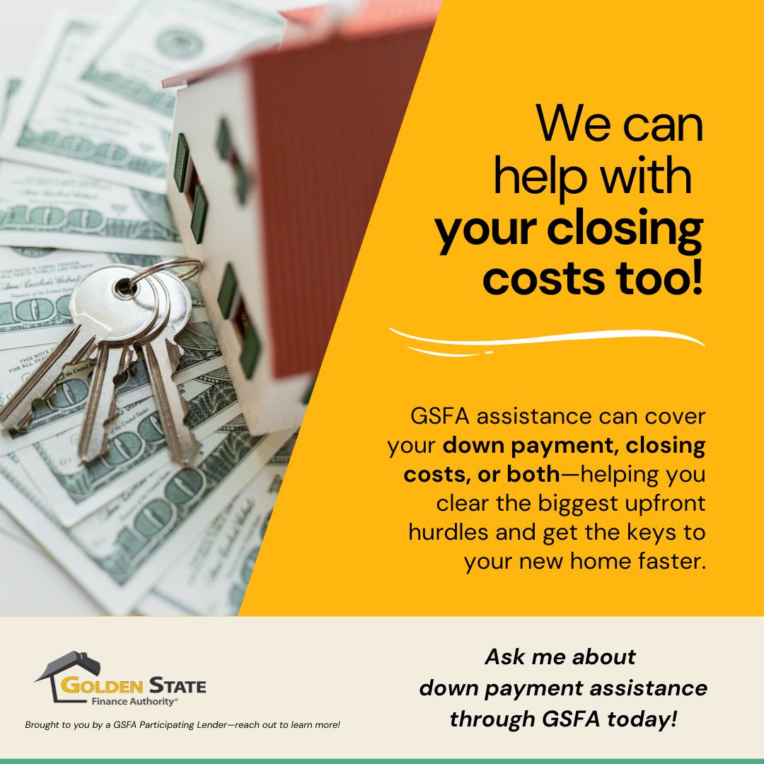 A rich gold-toned graphic featuring a red-roofed house sitting atop hundred-dollar bills with a set of house keys nearby. The headline reads: We can help with your closing costs too! GSFA assistance can cover your down payment, closing costs, or both—helping you clear the biggest upfront hurdles and get the keys to your new home faster.