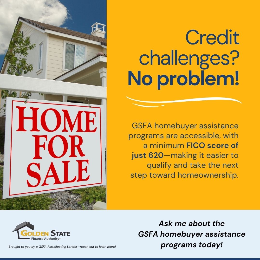 A gold-toned graphic featuring a yellow two-story house with a "Home for Sale" sign out front. The headline reads: Credit Challenges? No problem! GSFA homebuyer assistance programs are accessible, with a minimum FICO score of just 620—making it easier to qualify and take the next step toward homeownership.