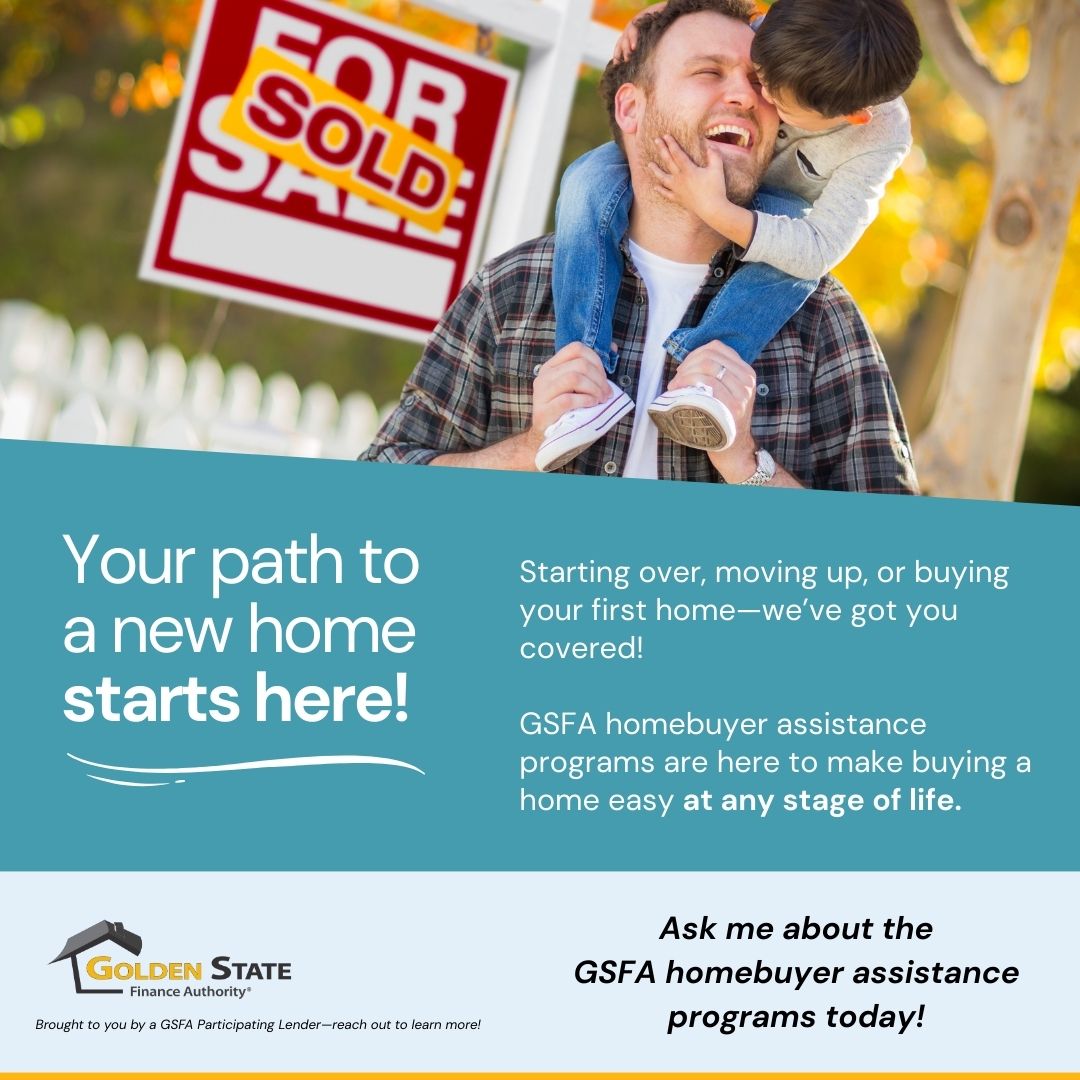 A teal blue graphic featuring a smiling man holding his young son on his shoulders in front of a "Home Sold" sign. The headline reads: Your path to a new home starts here! Starting over, moving up, or buying your first home—we’ve got you covered! GSFA homebuyer assistance programs are here to make buying a home easy at any stage of life.