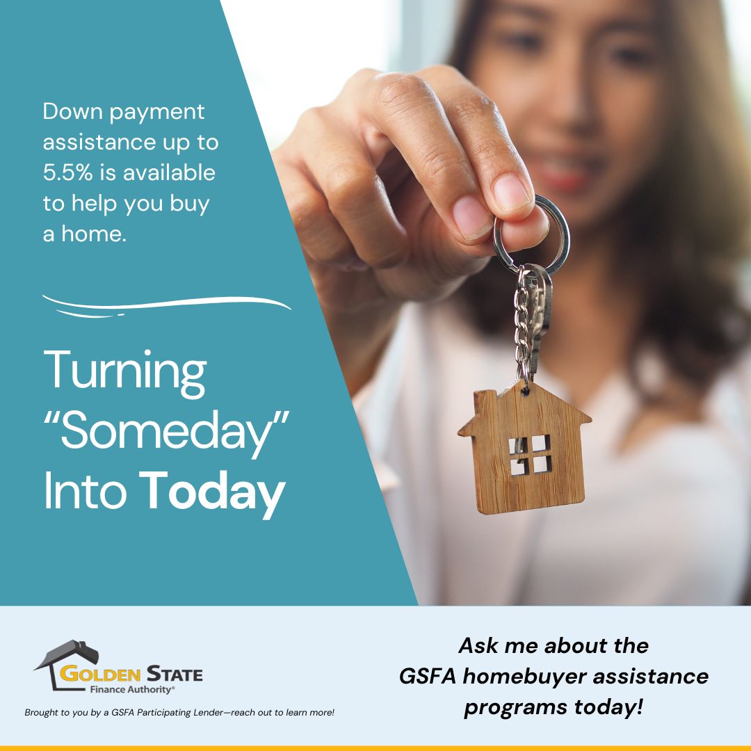 A teal graphic featuring a woman holding a keychain with a small house charm. The headline reads: Turning “Someday” into Today. Down payment assistance up to 5.5% is available to help you buy a home.