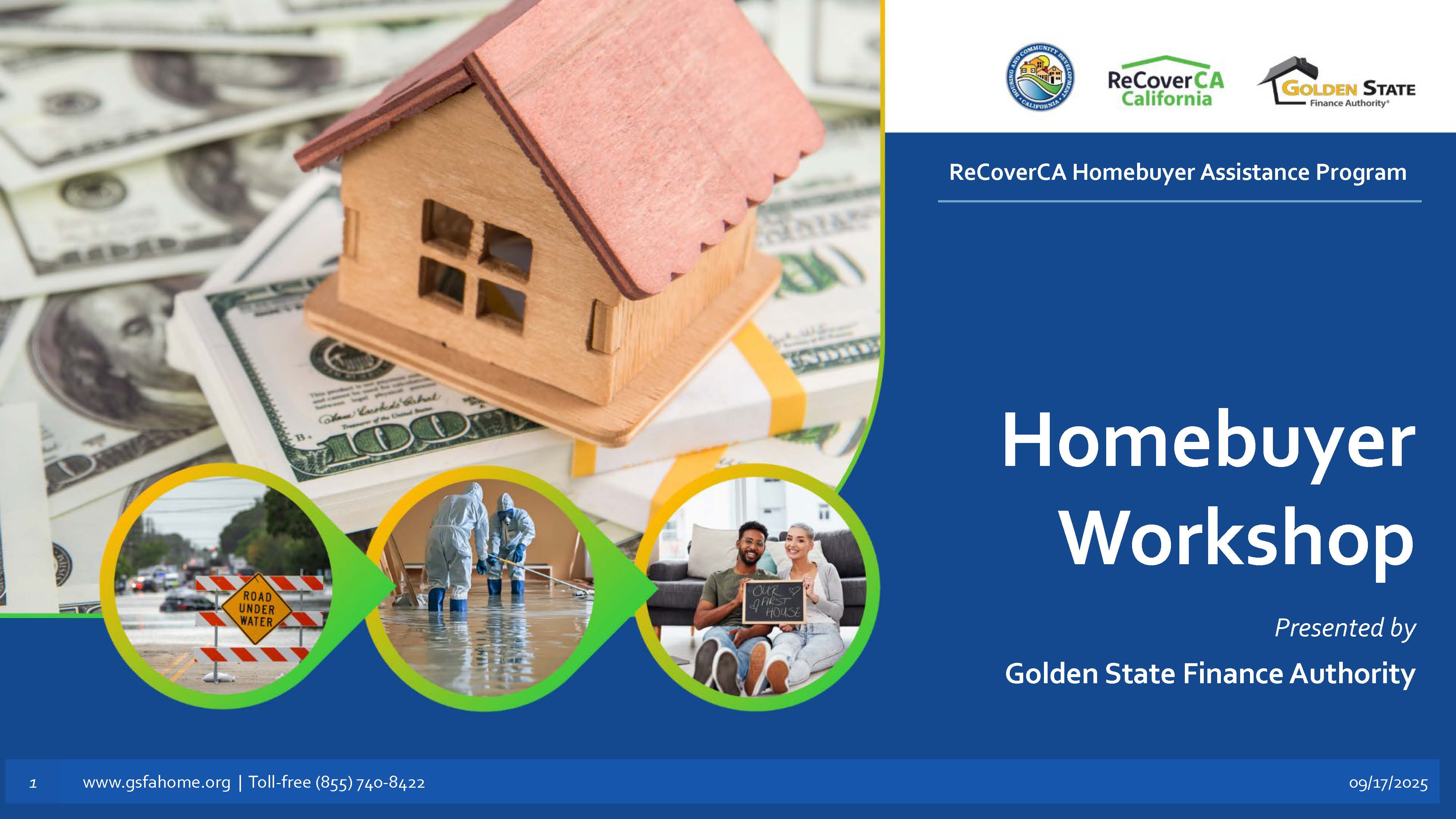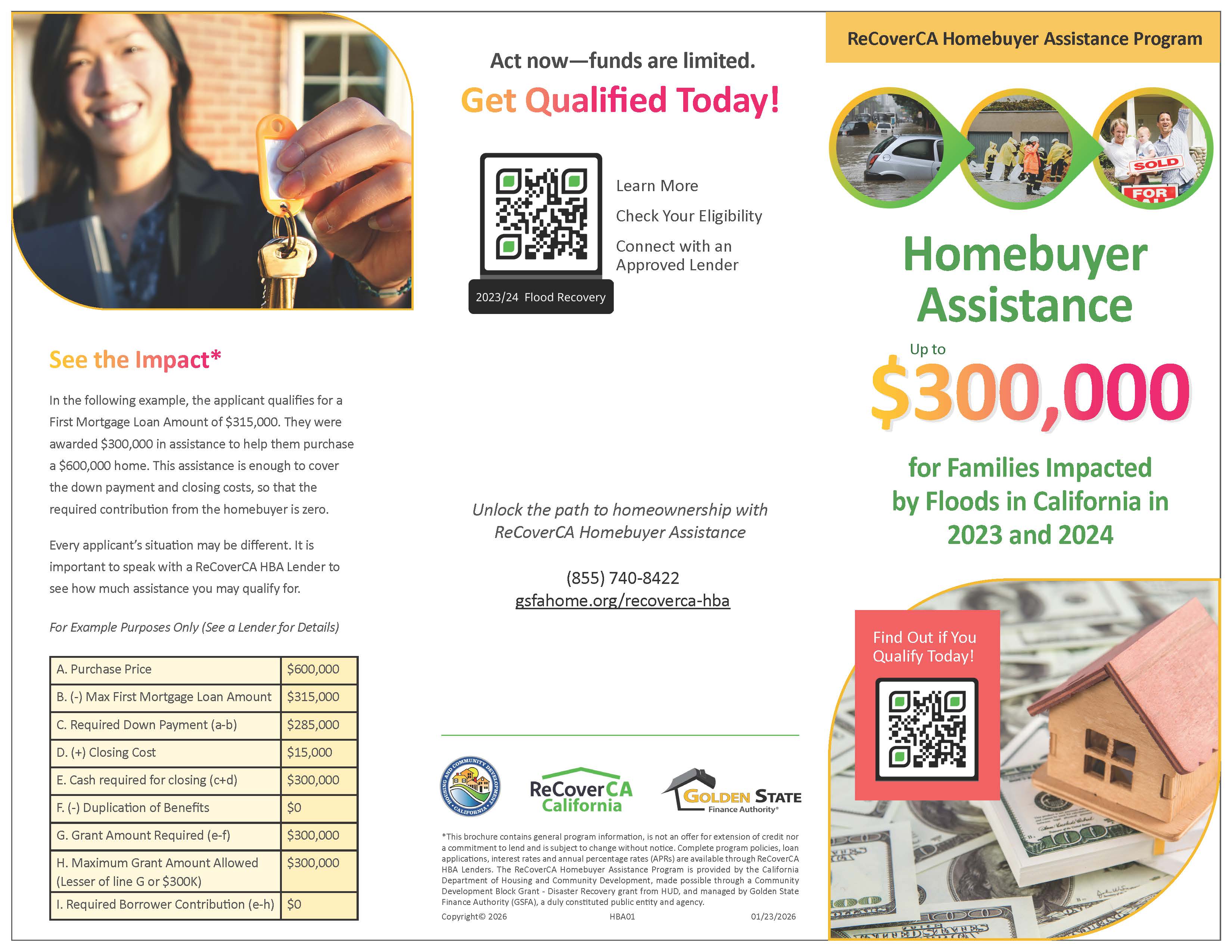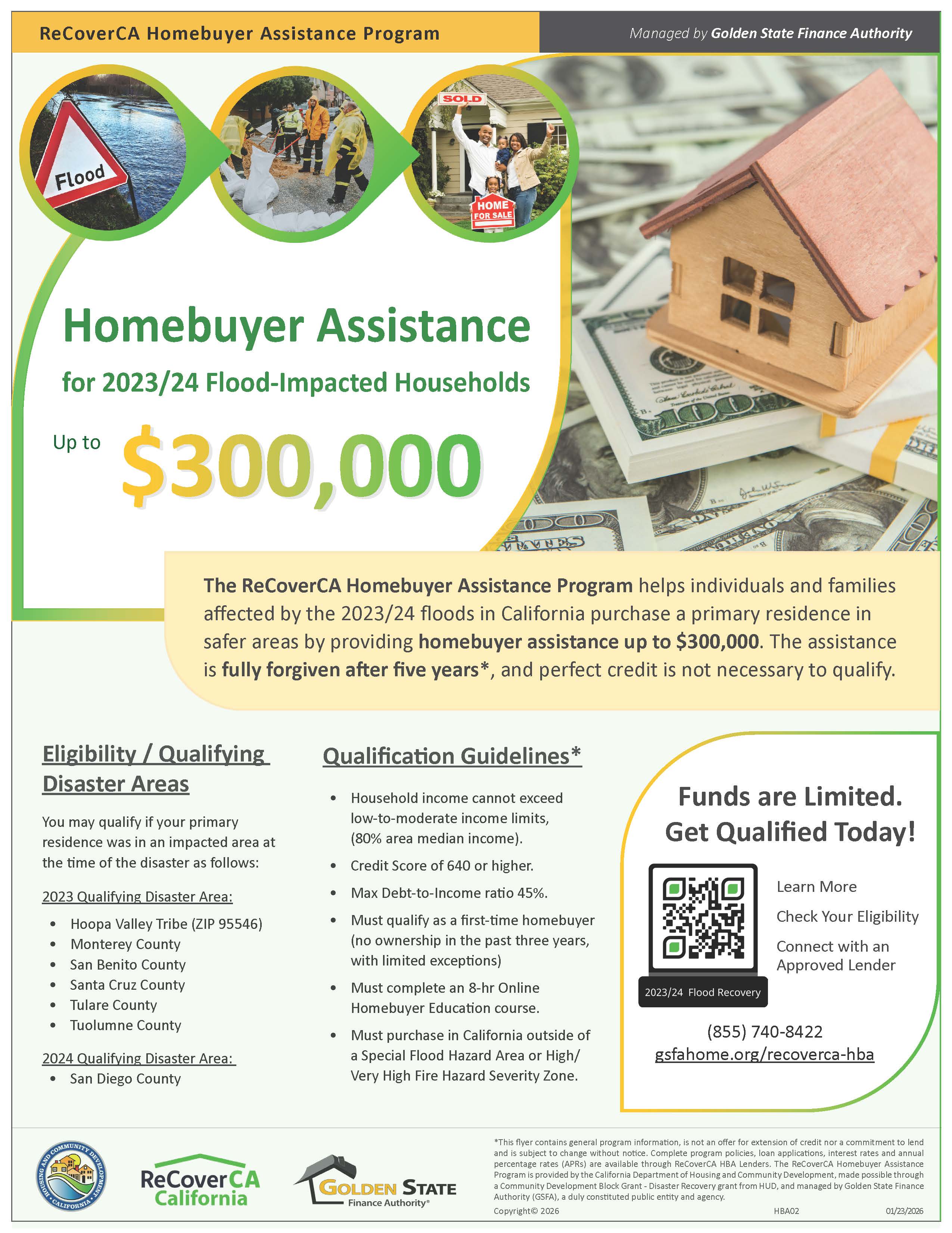 The ReCoverCA Homebuyer Assistance (DR-HBA) Program is provided by the California Department of Housing and Community Development (HCD) in collaboration with GSFA as Program Manager. Funding for the Program is made possible through a Community Development Block Grant - Disaster Recovery (CDBG-DR) grant from HUD.